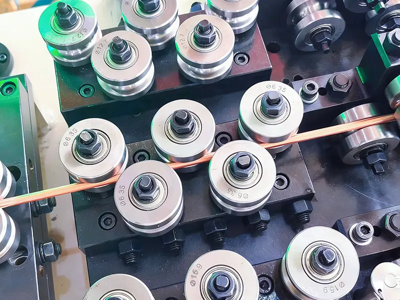 GRM Haddehane fabrikası, dikdörtgen mıknatıslı tellerin hassas şekilde şekillendirilmesi için tasarlanmış yüksek hassasiyetli elektromanyetik tel haddeleme tesisi sunmaktadır. Ekipman, ekstrüzyon veya soğuk haddeleme işlemlerini kullanıyor ve telin birden fazla haddeleme geçişi yoluyla hassas köşe şekillerine sahip olmasını ve emaye, kağıt veya polyester sargıyla yalıtılabilmesini sağlıyor. Haddehane, mükemmel bobin yoğunluğu ve yalıtım kalitesi sağlamak için üst düzey bir kalınlık ve genişlik kontrol sistemine sahiptir ve motorlar, transformatörler ve invertörler gibi yüksek performanslı elektrikli ekipmanların üretiminde yaygın olarak kullanılmaktadır.
